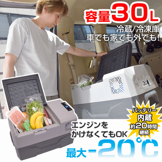 だから大容量30L、車でも家でも外でも使える バッテリー内蔵の冷蔵冷凍庫が役に立ちます! 最大-20度まで設定可能だから冷凍庫としても、 冷蔵庫としても使えて大容量30L。