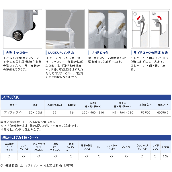●ワンアクションでフタを開閉できるラックトップレバー ●天面から引き上げる両面開き仕様で、左右が壁に挟まれてもフタの取り外しが可能 ●フタは落とすだけでロックが可能 ●堅牢なボディで大人が腰をかけても大丈夫 ●本体インナー部素材に、細菌の繁殖を抑制し清潔を保持する抗菌剤ノバロン(R)を採用 ●天面・底面・側面に断熱材を配し、高い保冷力を誇ります ●水抜き簡単ワンアクション水栓 ●ハイグリップラバー(ゴム足)を底4ケ所に配置 ●便利な内部トレー付 ☆